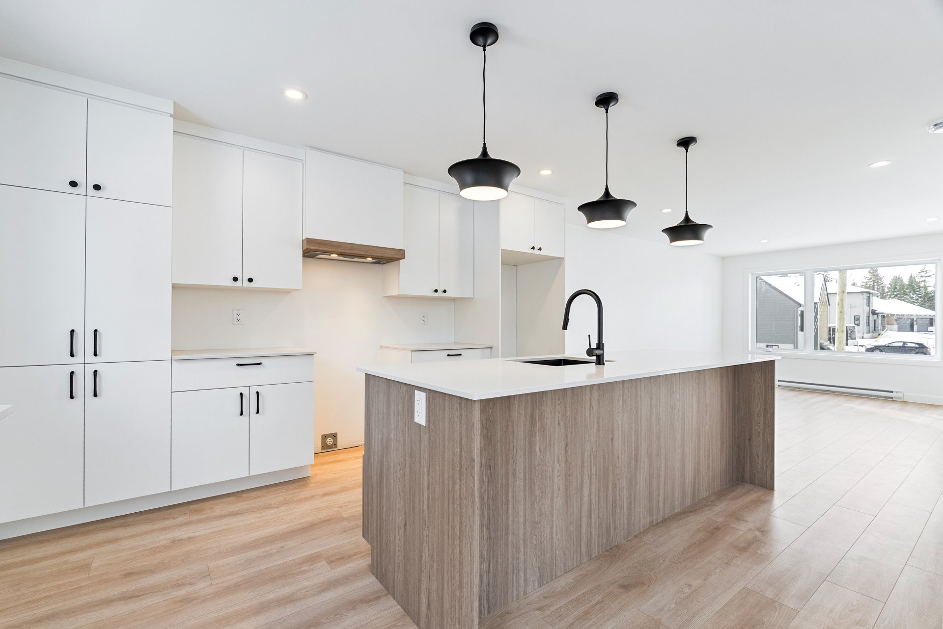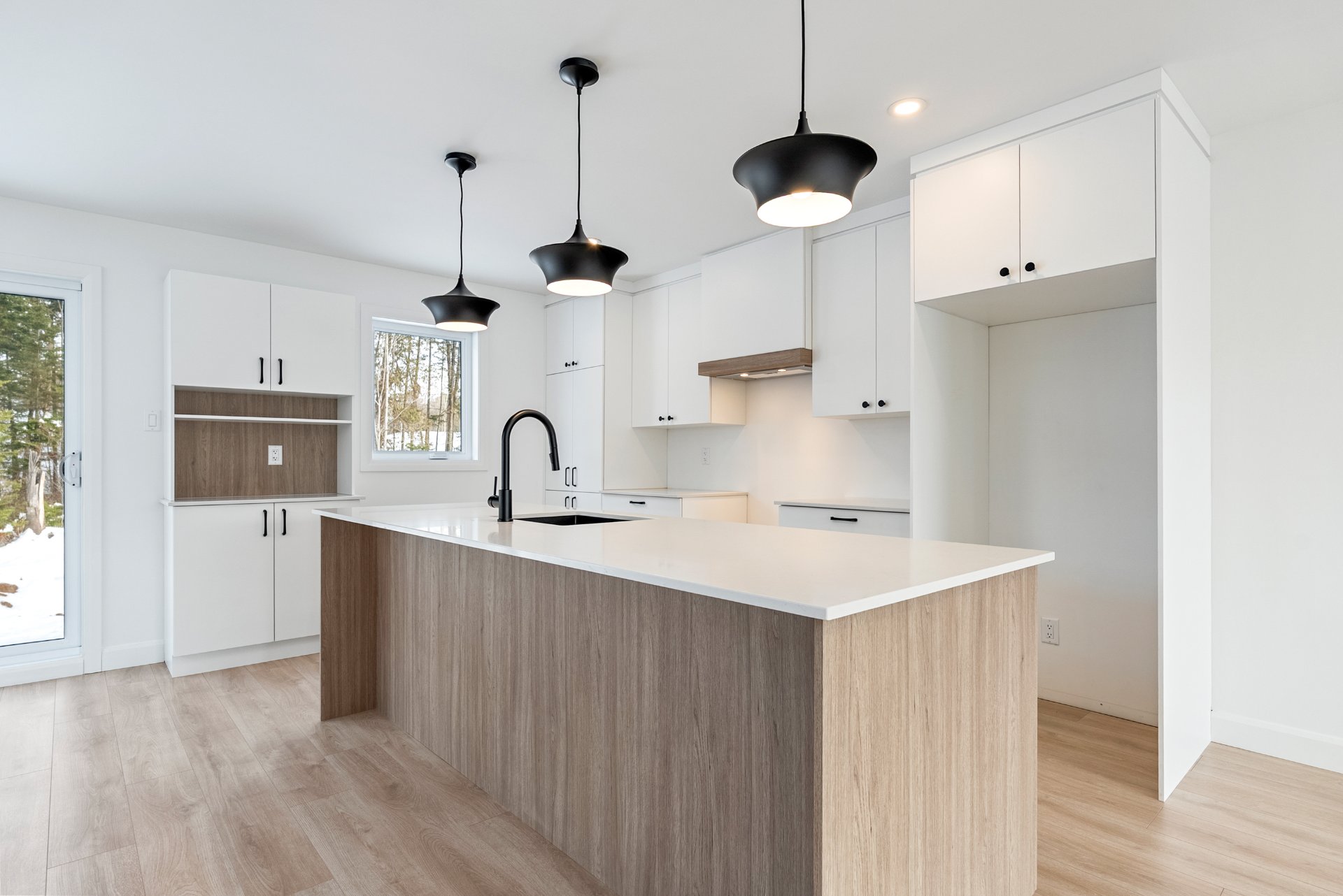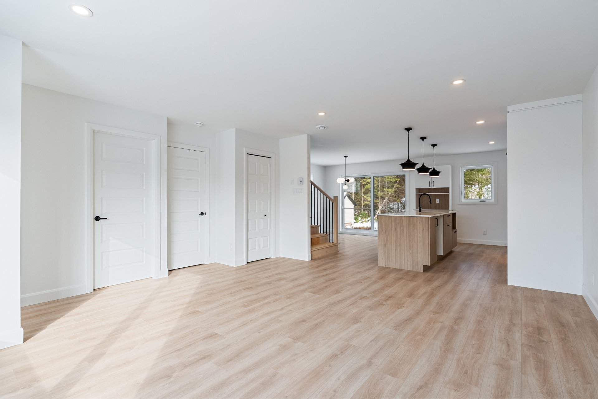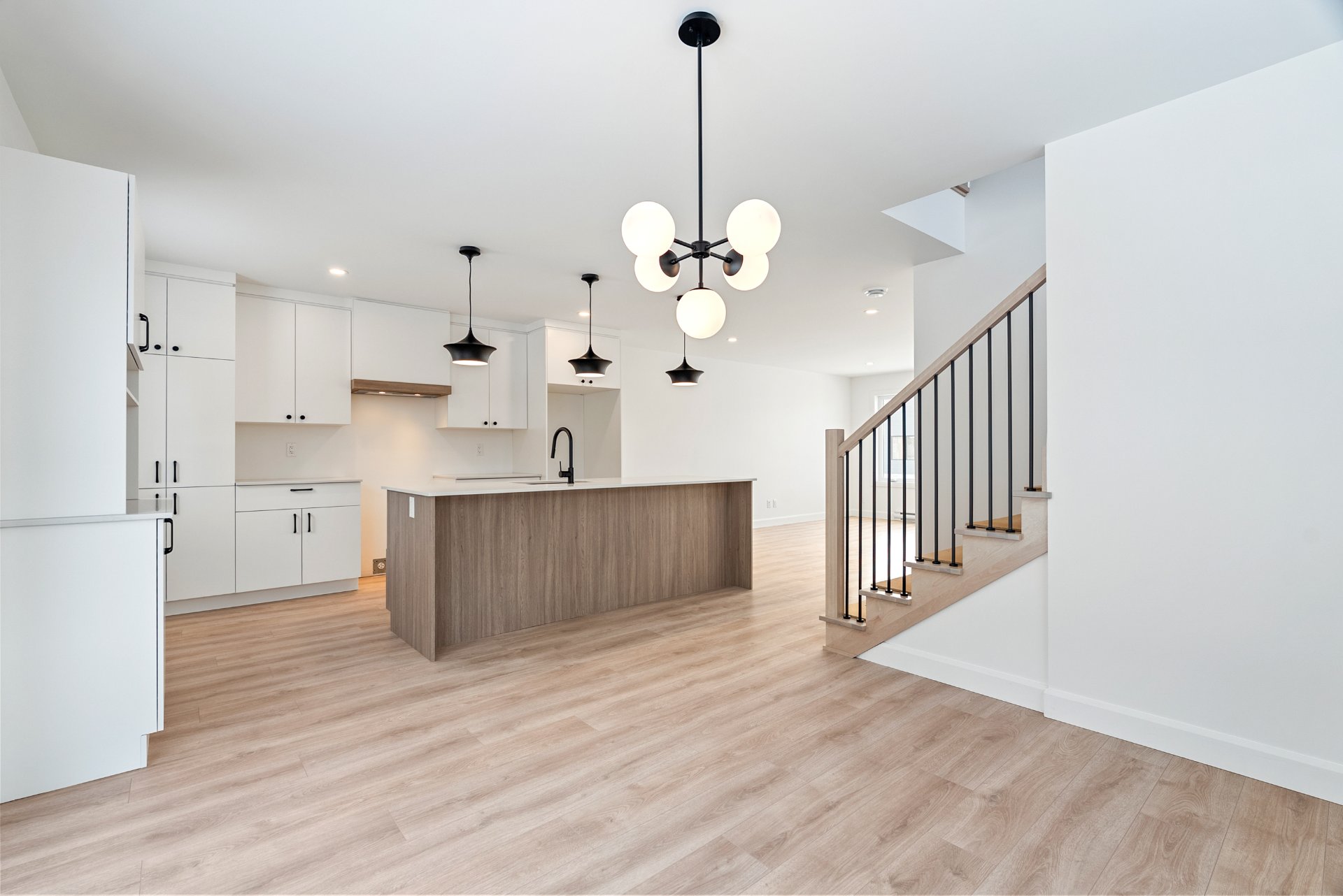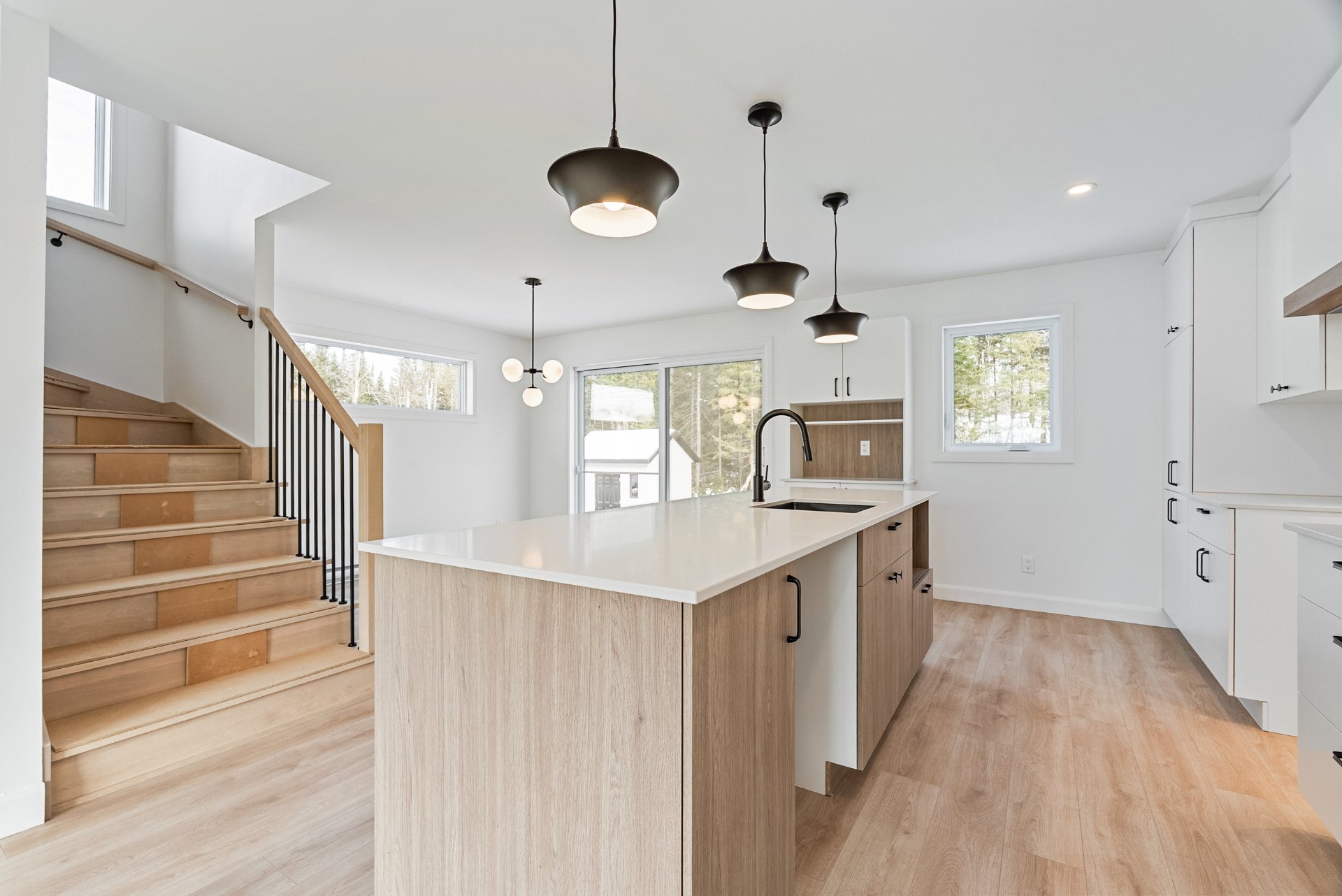 -Cuisine avec îlot et escalier en bois franc.